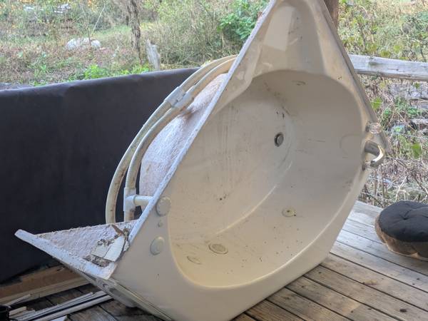 This is a corner bath with whirlpool jets. All in good working condition, just needs to be cleaned. Recently removed from a house to make room for a walk-in shower. The pump is in good working condition and all hoses and electrical connections are included. $150 or best offer. Must be picked up with a truck or trailer.