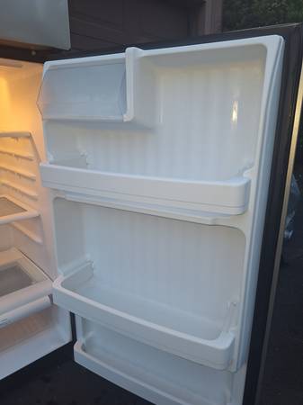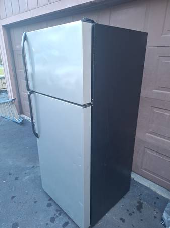 General electric refrigerator freezer. Top and bottom. Used in good condition. Ice maker and ice tray. Has all shelves and drawers as well as egg tray. New refrigerator light bulb. Black metal exterior, white interior. Cold and currently running.