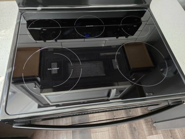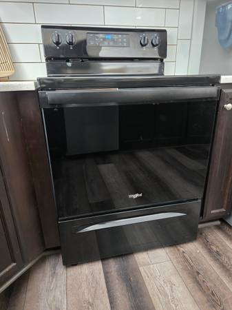 Whirlpool model WFE505W0HB All black. Lightly used for 6 months. Super clean, original condition. Stove used twice. Glass top is free from scratches and chips. 100% functional. Frozen Bake™...