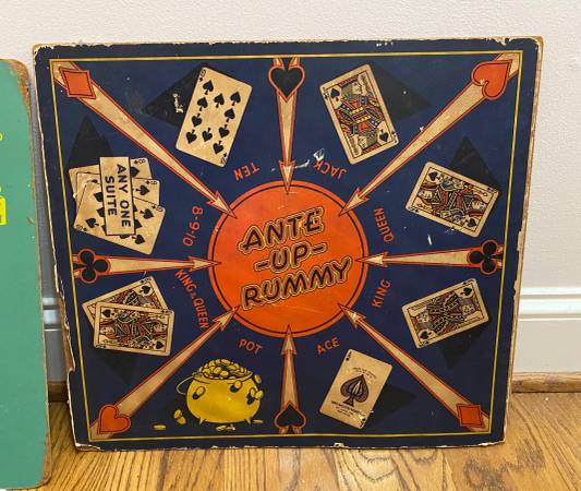 Super cool vintage game boards. The green board was made by American Visual Aids in Brookly NY during the 1950's. The other board was made by Northwestern Products Company in St Louis also during the 1950's. The St Lous board is 2 sided with Ante-Up Rummy on one side and Chinese Checkers on the other. Really fun collectible.