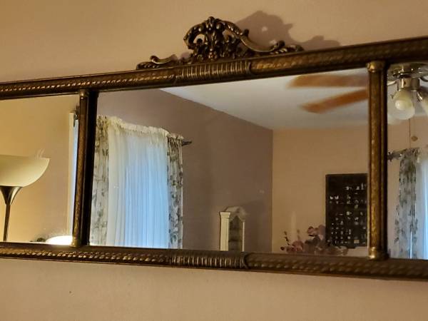 This is a beautiful three pane antique wall mirror. It is in good condition, except for a piece that is missing on the top of the frame in the center (please see pictures). This occurred during a move and I'm just not crafty enough to repair it properly. I'm sure it would be a great project for someone, or leave it as is. We have personally enjoyed having this mirror on display in our home for over thirty years. It is 45" long, 11.5" tall with the top ornament adding another 2.5" to the height in the center. Please see pictures and email with any questions. This comes from a smoke-free home. Thank you for looking!
