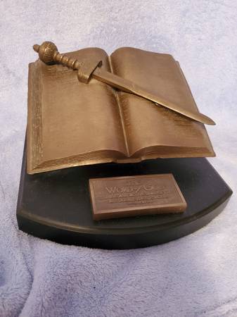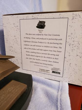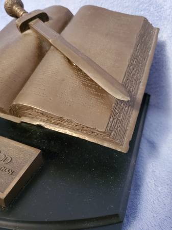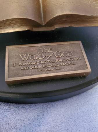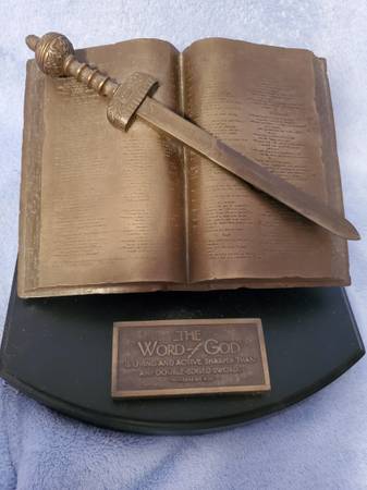 This is a beautiful sculpture that is for the encouragement of men and women of faith. It is the "Monuments of Faith " sculpture produced by Lighthouse Christian Products, The Encouragement Company. it a a wonderful piece, quoting Hebrews 4:12. "The Word of God ". It has been on display in a smoke free home. includes original box an packaging. Please see pictures and email with any questions. Thank you for looking!