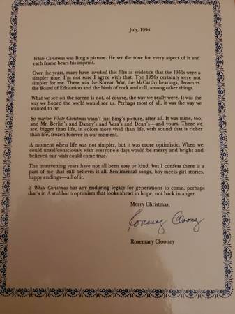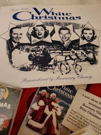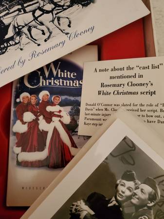 This is a wonderful collection from 1984 of Irving Berlin's "White Christmas" . It is a boxed set that includes a VHS of the movie, a CD of songs from the movie (featuring Danny Kaye, Bing Crosby, and Peggy Lee), a great 8x10 glossy black and white photo of the stars, a letter from Rosemary Clooney, a copy of her script and a booklet of photographic memories of Rosemary Clooney. This would be a wonderful gift for any fan of this classic movie! As far as I know the VHS works, but I haven't tested it. Obviously the real winner in this is all the wonderful memorabilia that Rosemary Clooney chose to share. This was on display in a smoke-free home every Christmas for many years. Please see pictures and email with any questions. Thank you for looking!