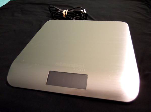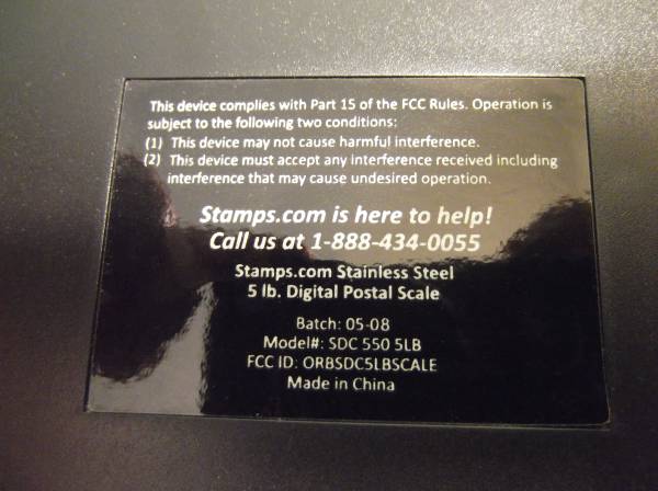 Nice 5 lb scale. You can use it as a food scale. Compatible with Stamps.com, if you're weighing packages. Model #: SDC 550. Stainless steel. Measures 7.75"x7.75"x0.75". Comes with USB power cord. You can plug it in to any outlet or your computer.