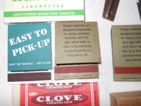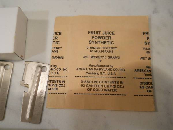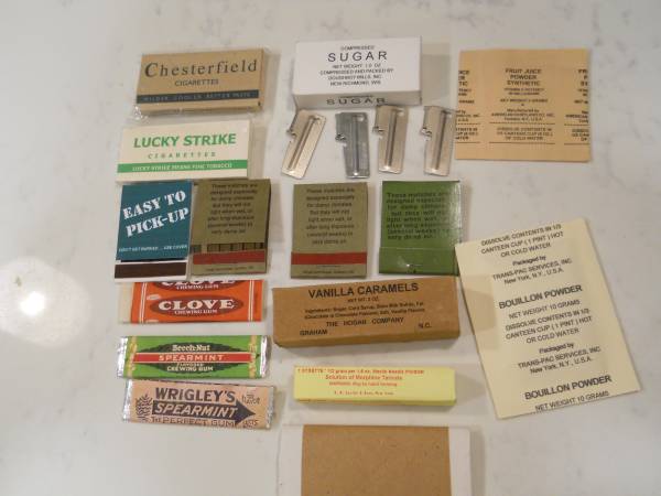 These items are reproductions of those found in Army World War II "K"-rations. They are in mint condition and are perfect for displays or for reenactments: "P-38" can openers (4), cigarette packs (2), match packets (4), sugar cubes (1), chewing gum (3), toilet paper (1), vanilla caramel candy (1), fruit drink powder (1), bouillon powder (1), medical syrette (SYRETTE IS NOT REAL; IT IS A NON-FUNCTIONING STAGE PROP AS IN A PARATROOPER'S FIRST AID PACKET).