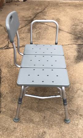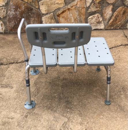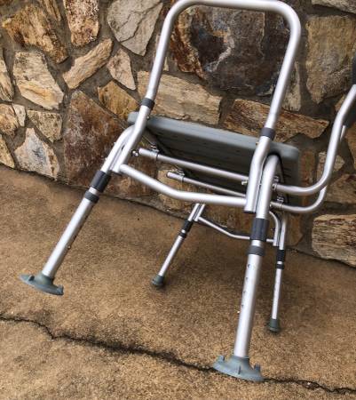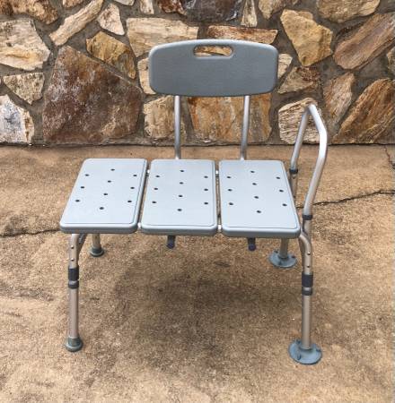 Fits over tub rail. Backrest. Adjustable legs. Large suction cups on legs.