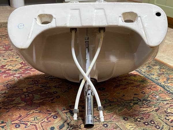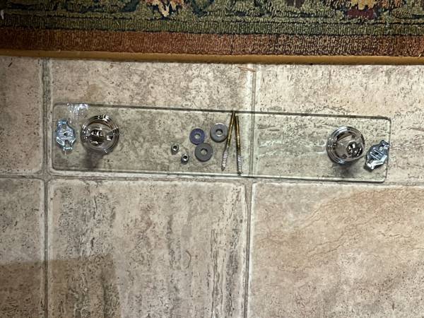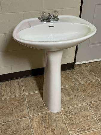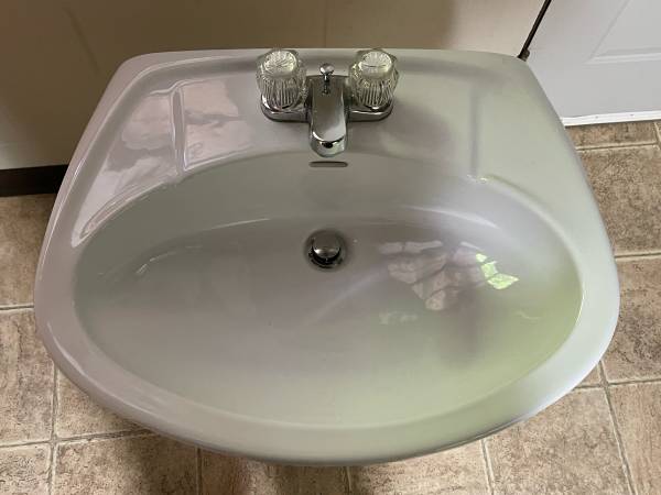 Used sparingly in a guest bath, this sink and faucet is complete and ready to install. Looks new. No leaks and faucet needs nothing. Small glass shelf included. Save $$$ !
