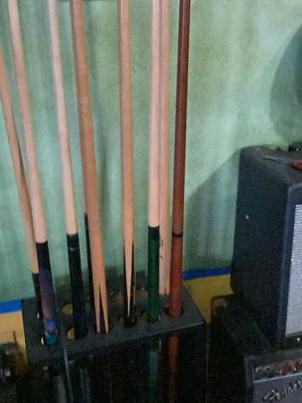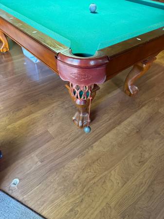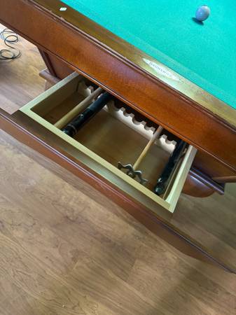 Pool balls, cues, cue stand, claw foot base, 2 pull out drawers on each end for extra storage