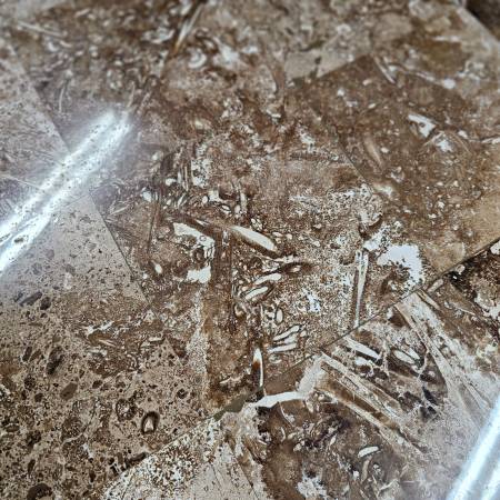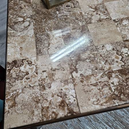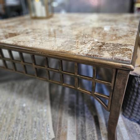Large Italian style, stone tile cocktail table with gorgeous metal base & legs. Extremely Heavy! Has some slight scratches on the sides, but nothing notable. Measures 49" x 43" x 19" high....