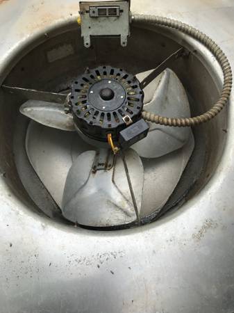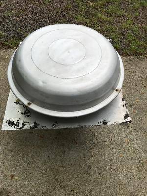 Power Roof Fan. 15" Dia. Fan with Adjustable Thermostat. 28" x 28" Roof Flashing. Aluminum Flashing and Hood. Used, Removed when re-shingled. Will demo running.