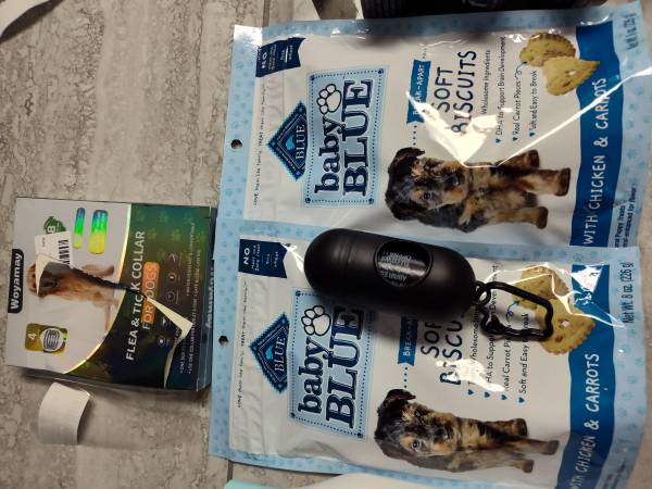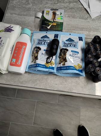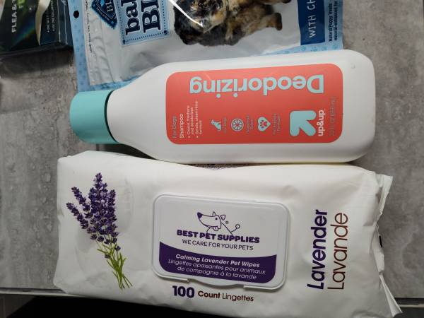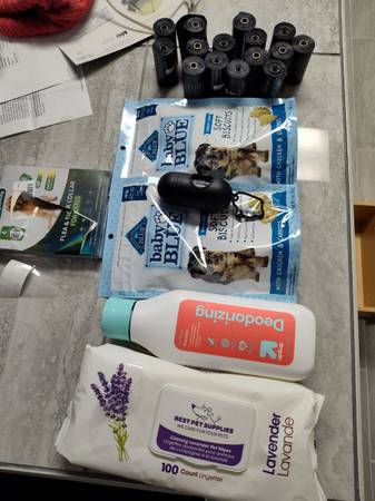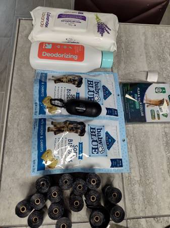 Deodorizing shampoo for dogs. Lavender pet wipes. Baby blue soft biscuits. Flea and tick collar for dogs one. Over 400 poop waste bags with key chain holder. All one lot for $20