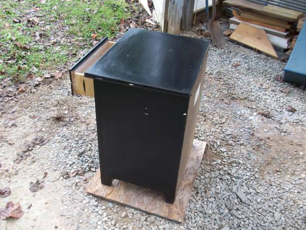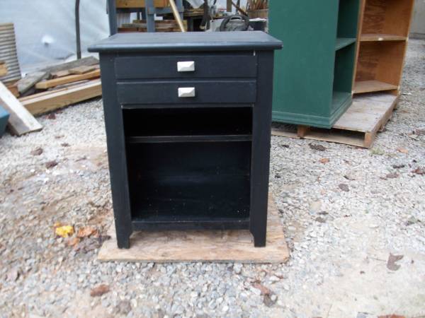 Bed nightstand or end table with drawer and 2 shelves. Heavy construction. Can be lightly sanded and painted as needed.
