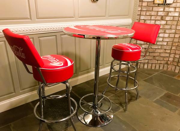 Enjoy the feeling of nostalgia and decorate game room or small kitchen with these Coke chairs and table. Great for dining or playing games. Retail for 749 but hard to find. One table and two chairs, new for 499 fully assembled. Just reduced price!