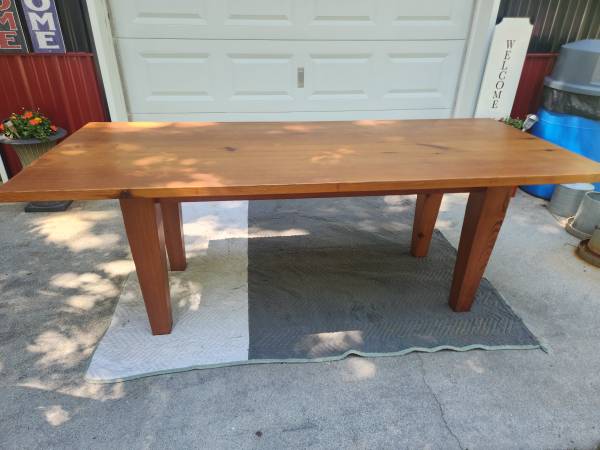 Large solid wood dining table and six chairs. 2 padded captain chairs and 4 fabric chairs. Great condition!! $200 or BRO