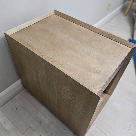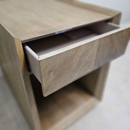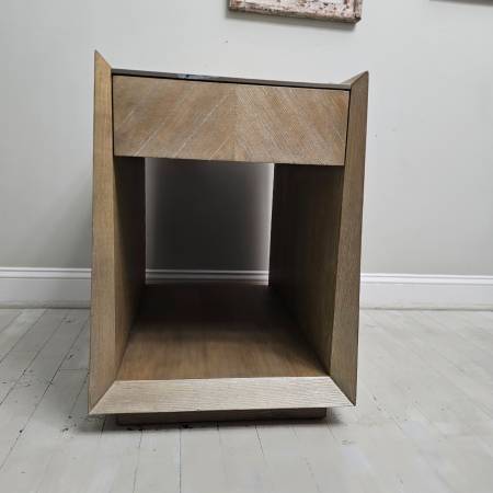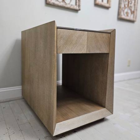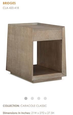 New! Caracole Brand, "Bridges" end occasional table night stand, 1 drawer with soft close feature, gorgeous ash Driftwood finish, measures 21"wide x 27" deep x 27.5" high. This piece has a slight scratch on the front top edge. (See pictures)