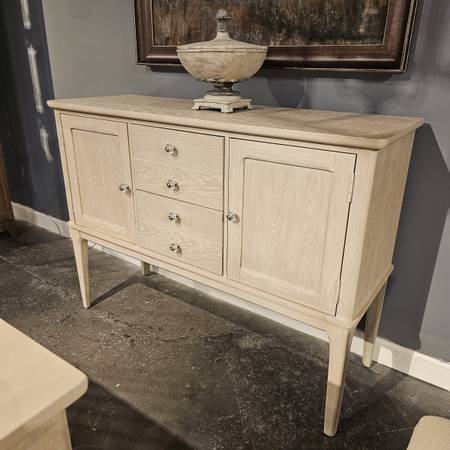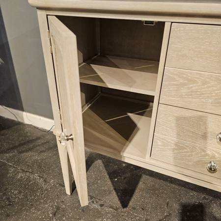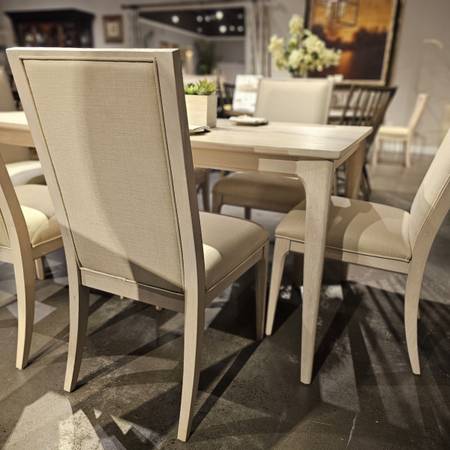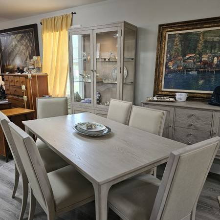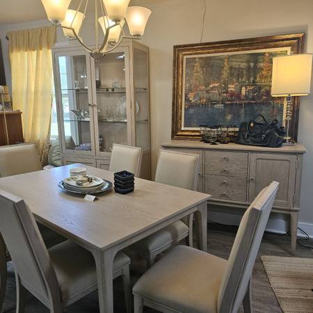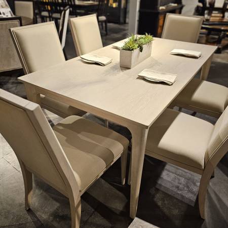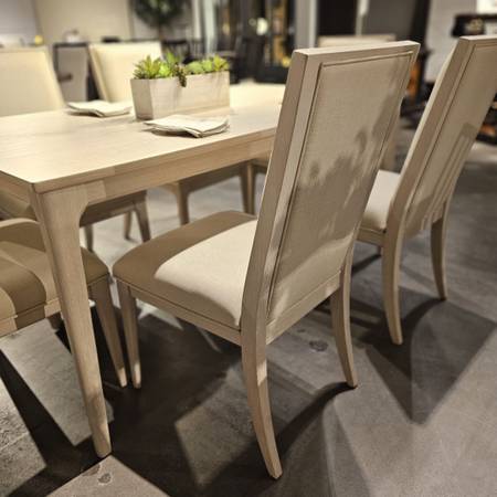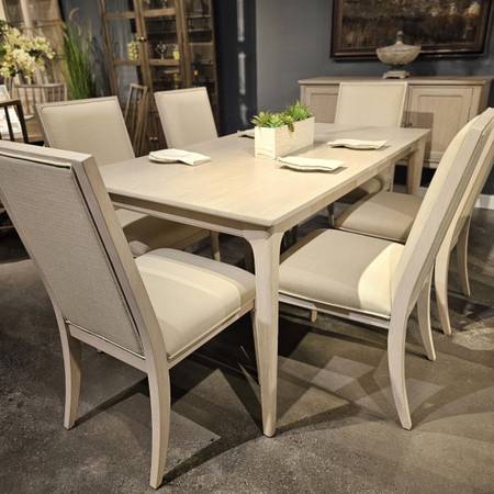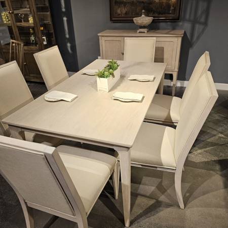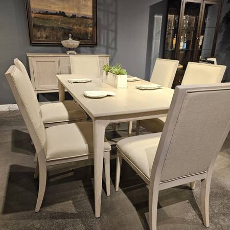 New☆ Showroom sample Dining set in a creamy white finish with table, 6 upholstered seat chairs, & sideboard with gorgeous hardware!