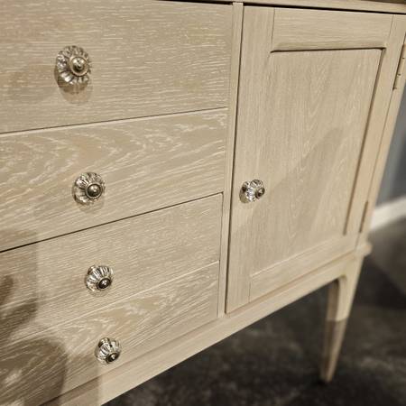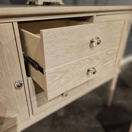 Oak veneers & wire-brushed poplar solids in a Branch finish.
