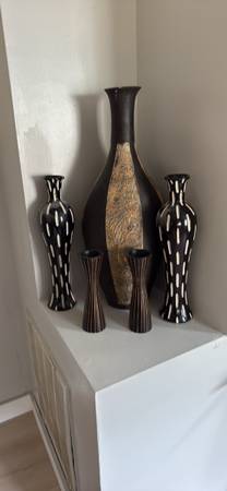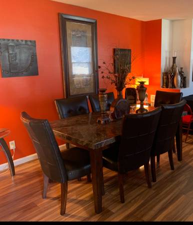 Dining room table with six chairs, five paintings, one large and four midsize paintings. Also five decorative vases. Decorate your whole dining room in one purchase.