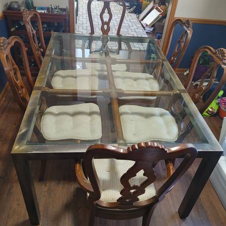 Large dining room table with glass top and brushed brass frame. 6 chairs included as shown. Paid over $2000 for this set. Text .