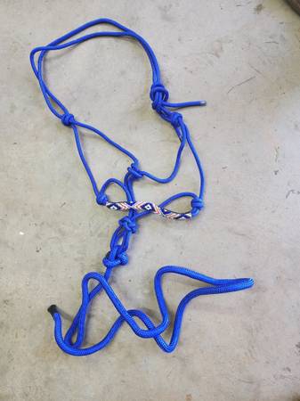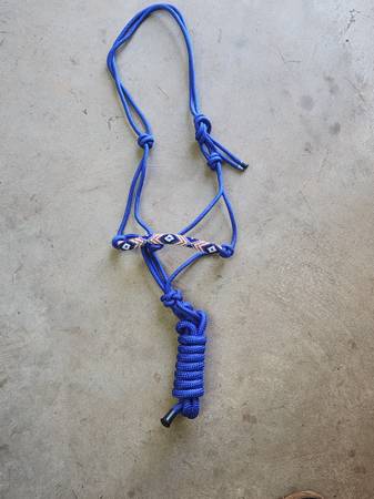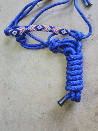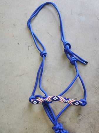 New Cowboy Knot Rope Halter with Beaded Aztec Design nose band and 6' Lead. This adjustable rope halter features a beaded Aztec design on noseband and removable 6' lead. They are for an average full size horse.
