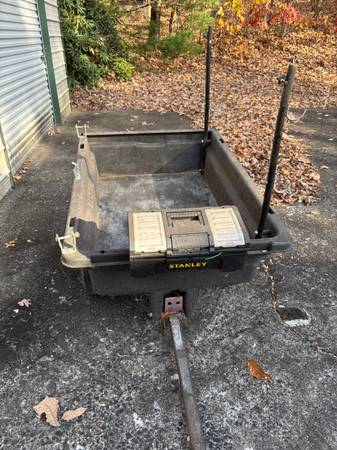 Rubbermaid yard cart converted to home landscape trailer, with racks for weed eaters and tool box