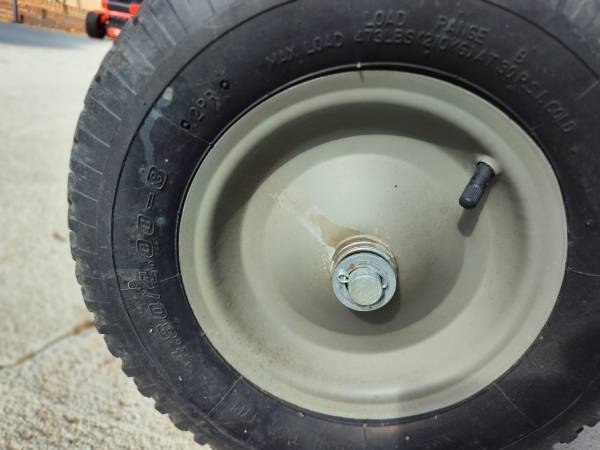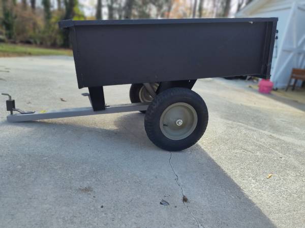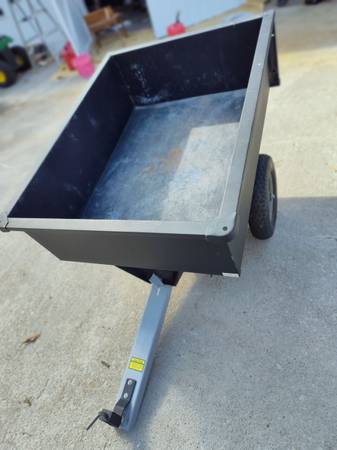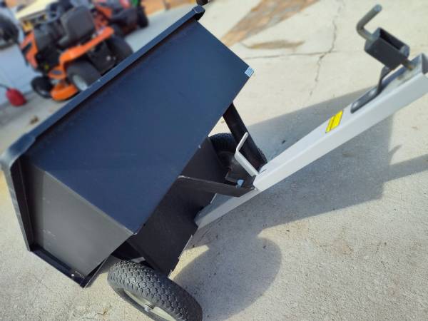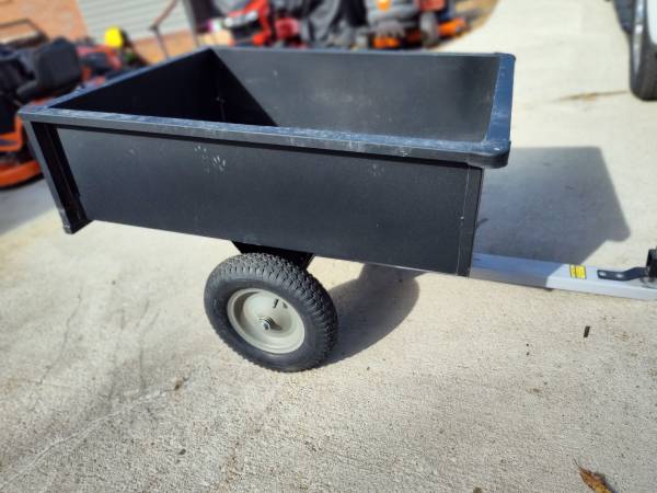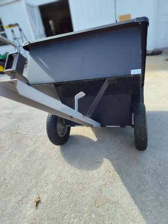 Like new condition tall tires makes it set up higher off the ground for dumping. Lawn cart dump capability All steel removable tailgate spring loaded tongue hitch release