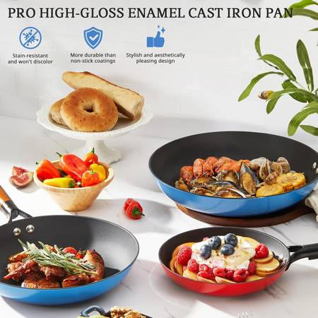 KITESSENSU Enameled Cast Iron Skillets - Non Stick Frying Pans Set with Durable Wooden Handle - 8&10&12 In Titanium Cast Iron Pans for Multi-Cooking - Pre Seasoned Cookware Set - Gradual Cobalt Blue; B0DSKWMXSW