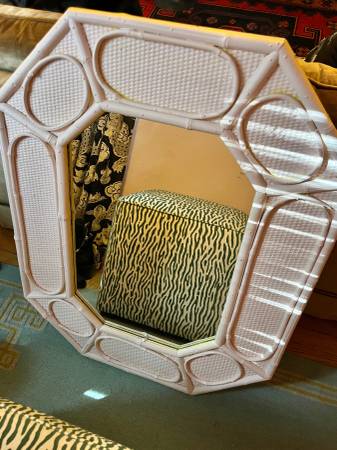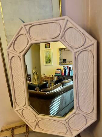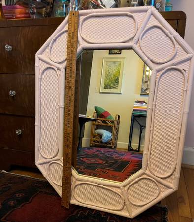 Vintage rattan mirror 1970s? measures about 28 inches across and 36 tall. It has bee painted pale pink with yellow paint underneath. Good vintage condition. Glass has a couple black spots as shown. Could be repainted or stripped. Delivery within Winston only or meet at Thruway/Cloverdale shopping.
