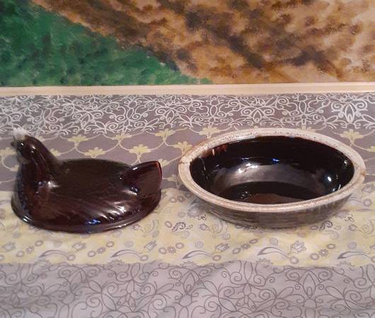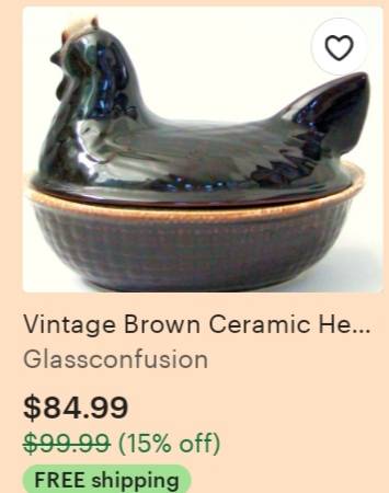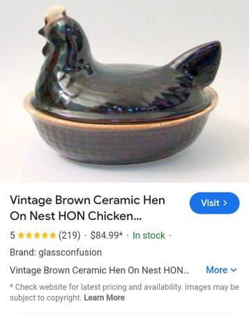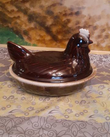 I have a Vintage Brown Drip Hen Chicken On Nest Casserole Covered Baking Dish that measures 11" long x 8" wide x 9 " tall and the bowl is around 3" deep. Asking price is $50.