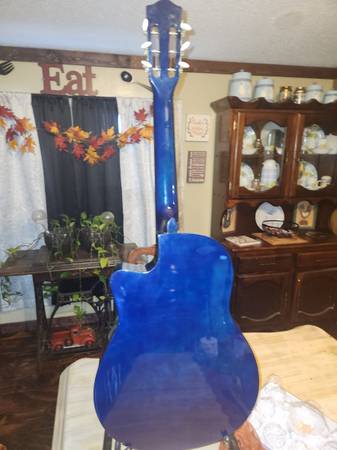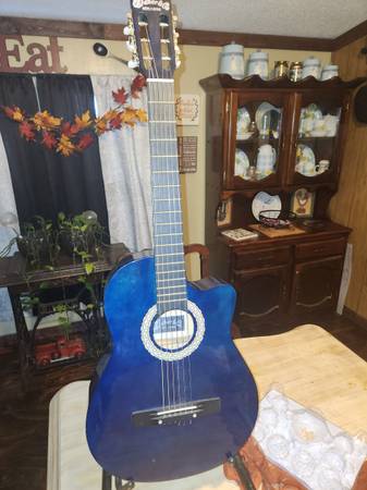 No name brand blue classical cutaway guitar. Plays great sounds great $50
