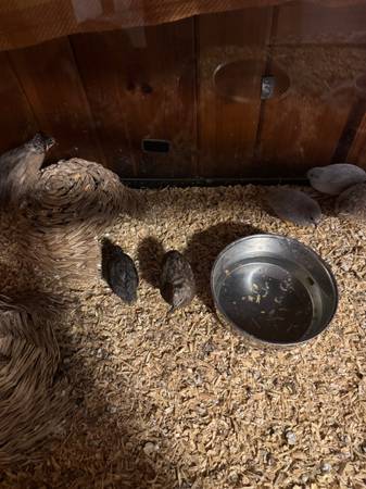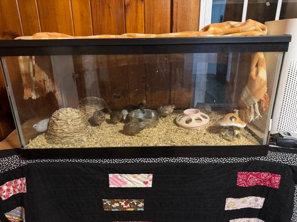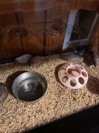 Button quail plus 55 gallon tank with screen lid. Whatever food and shavings left over. Most are laying. Rehoming fee $100 for everything