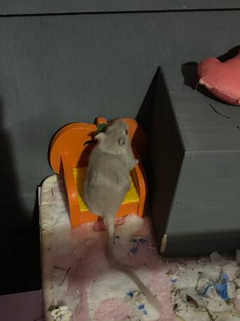 Hi! i’m trying to rehome my gerbil, monkey. she will come with everything she needs, chews, treats, hay, food, a wheel, hides, a few blankets, her cage (i will send a picture of it, if interested), and a water bottle. i’m about to start working full time so i won’t have enough time to give her life she needs. she’s very sweet, just needs to be handled more. there is a rehoming fee of $60 as her cage was $140, but i’m willing to negotiate.