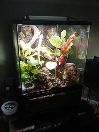Rehoming mourning gecko group. Group has 2 adults and not sure how many babies. Eggs are being laid consistently with new babies added so not sure how many in setup currently. Setup has been running for a year with adults laying eggs for about a year. Easy to take care of. Nice enclsoure with live plants, dwarf white isopods, and spring tails. Enclsoure has driftwood and cork bark. Ugb light and led grow ligjts included. Spent near 900.00 building this enclsoure. Rehoming geckos with enclosure, lights, extra hides, 2 smaller starter enclosures with a live plant in both. Asking 400.00 for all.