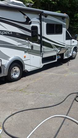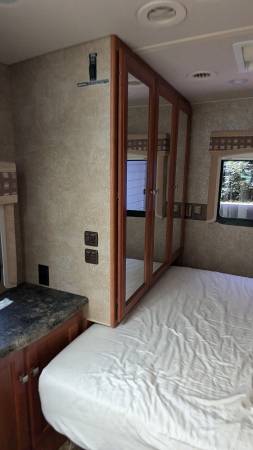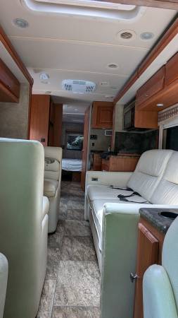 Upgraded leather furniture, 3 flat screen TVs one in the outdoor entertainment Ctr, micro/convection oven, 3 burner stove top, E450, 32 ft, onan 4000 generator, auto leveling w/ snap pads, 3 slides w/toppers, NEW 15,000 BTU AC w/ heat pump, 14 ft power shielded awning, fantastic and bathroom fans are covered, extra tint windows, mirrored closet doors, DVD player, 3 slides, back up camera, full body paint, fiberglass roof, two new deep cell marine house batteries, insulated cap over cab, under shelter when not traveling, everything works as it should. No pets, no smoking.