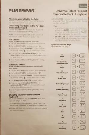 Puregear Bluetooth Keyboard Charges with a micro-USB input. Operation manual included. Packaged in a leather-like carrying case with a foldable, popup stand. I will deliever to a Winston-Salem fast...