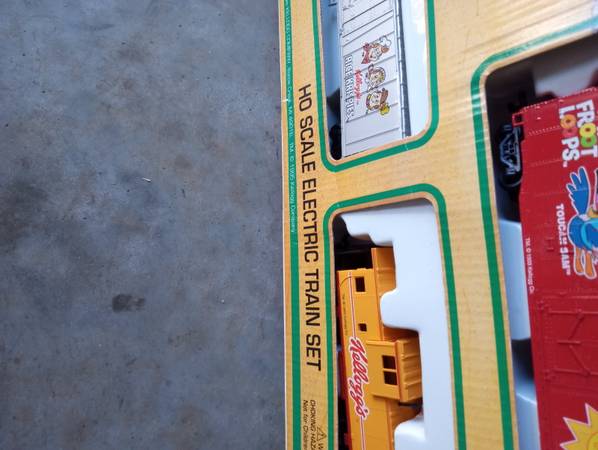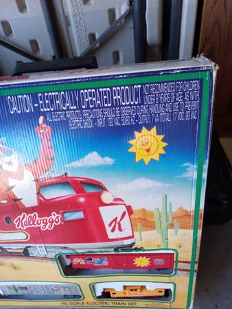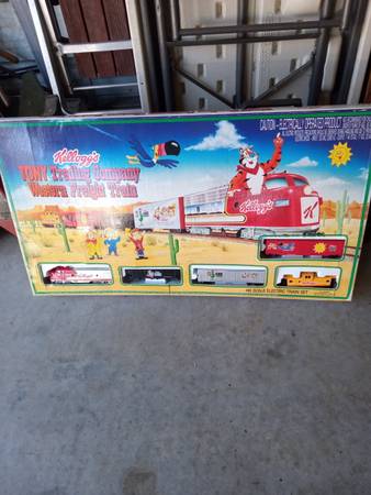 Kellogg;s Tony Trading Company Western Freight Train in original box for ages over 8 years old. This is HO scale electric train. Has all the track shown in the different configurations. We have not taken it out of the box. It has been stored since the 1990's. Buying as is for cash and carry. We can meet you in the Yadkinville area. Phone or text to Three,Three,Six, 813-0113 before 9 at night.