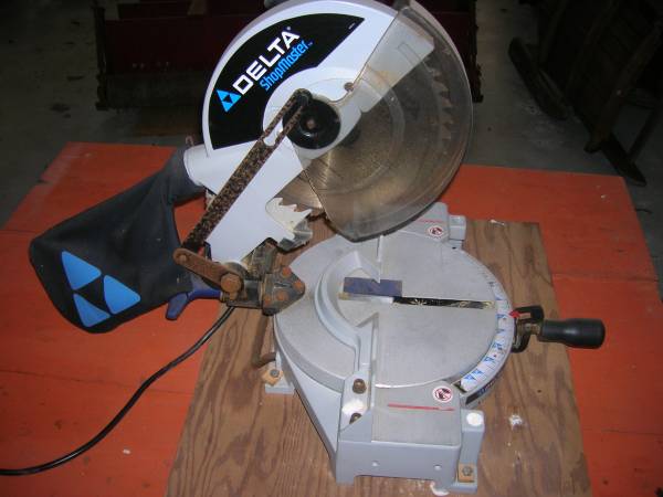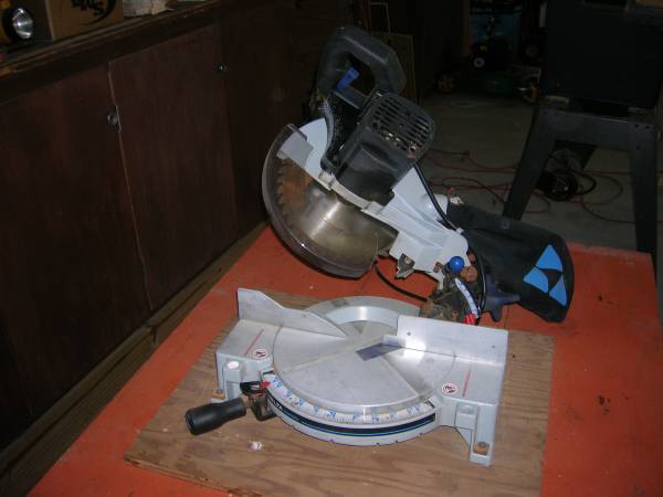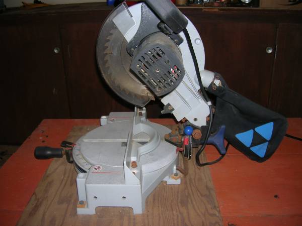 10" miter saw. Some minor rust on bolt heads and bare metal parts but nowhere that it matters. Used little. Still in good shape. Attached to 3/4" x 2' square plywood base.