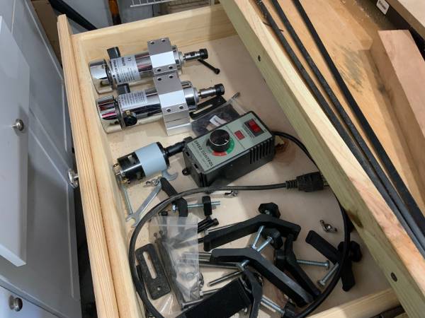 TWO Trees TTC 450 CNC machine with one 500watt spindle and two never used 800 watt spindles with speed control units, one for 500 watt and one for 800 watt ,machine like new used only one time, comes with handmade cabinet with shop vac included and several bits. Cash only pickup best offer see pictures. Also comes with 10 watt laser never used.