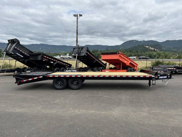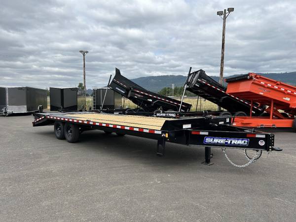 The ST102205LPDO2A-B-150 is a heavy-duty 8.5' x 25' low-profile deckover equipment trailer from Sure-Trac, engineered for serious hauling with a 15,000 lb GVWR and a rugged steel I-beam frame. Its standout feature is the 5' beavertail with spring-assisted stand-up ramps, making it ideal for loading heavy machinery or vehicles. The trailer rides on tandem 7K slipper spring axles with ST235/80R16E radial tires and includes a 12K drop-leg jack, adjustable 2-5/16" coupler, and full LED DOT-compliant lighting. With pressure-treated wood decking, six D-rings, stake pockets, and a rub rail, it offers versatile tie-down options and reliable performance for contractors, landscapers, and equipment haulers alike.